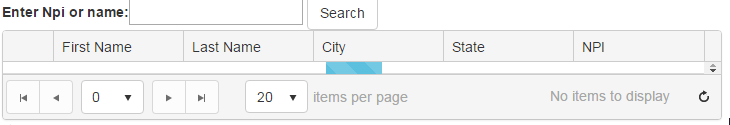 @(Html.Kendo().Grid<vNPISearch>() .Name("npi-grid") .Columns(columns => { columns.Template(x => { }).ClientTemplate("#=GetPecosStatus(PecosNPI) #").Width(50); columns.Bound(x => x.ProviderFirstName).Title("First Name"); columns.Bound(x => x.ProviderLastName).Title("Last Name"); columns.Bound(x => x.ProviderBusinessLocationAddressCity).Title("City"); columns.Bound(x => x.ProviderBusinessLocationAddressState).Title("State"); columns.Bound(x => x.NPI).Title("NPI"); }) .DataSource(dataSource => dataSource .Custom() .Schema(sch => { sch.Model(m => { m.Id("NPI"); m.Field(f => f.NPI).Editable(false); m.Field(f => f.ProviderFirstName).Editable(false); m.Field(f => f.ProviderLastName).Editable(false); m.Field(f => f.ProviderBusinessLocationAddressCity).Editable(false); m.Field(f => f.ProviderBusinessLocationAddressState).Editable(false); }); }) .Type("odata-v4") .Transport(transport => { transport.Read(read => read.Url("http://localhost:58242/api/PecosSearch/Search?id=" + Model.SearchTerm)); }) .PageSize(20) .ServerPaging(true) .ServerSorting(true) .ServerFiltering(true) ) .Scrollable(scr => scr.Height("auto")) .Sortable() .Pageable(pageable => pageable .Refresh(true) .PageSizes(true) .ButtonCount(5)))7 Answers, 1 is accepted