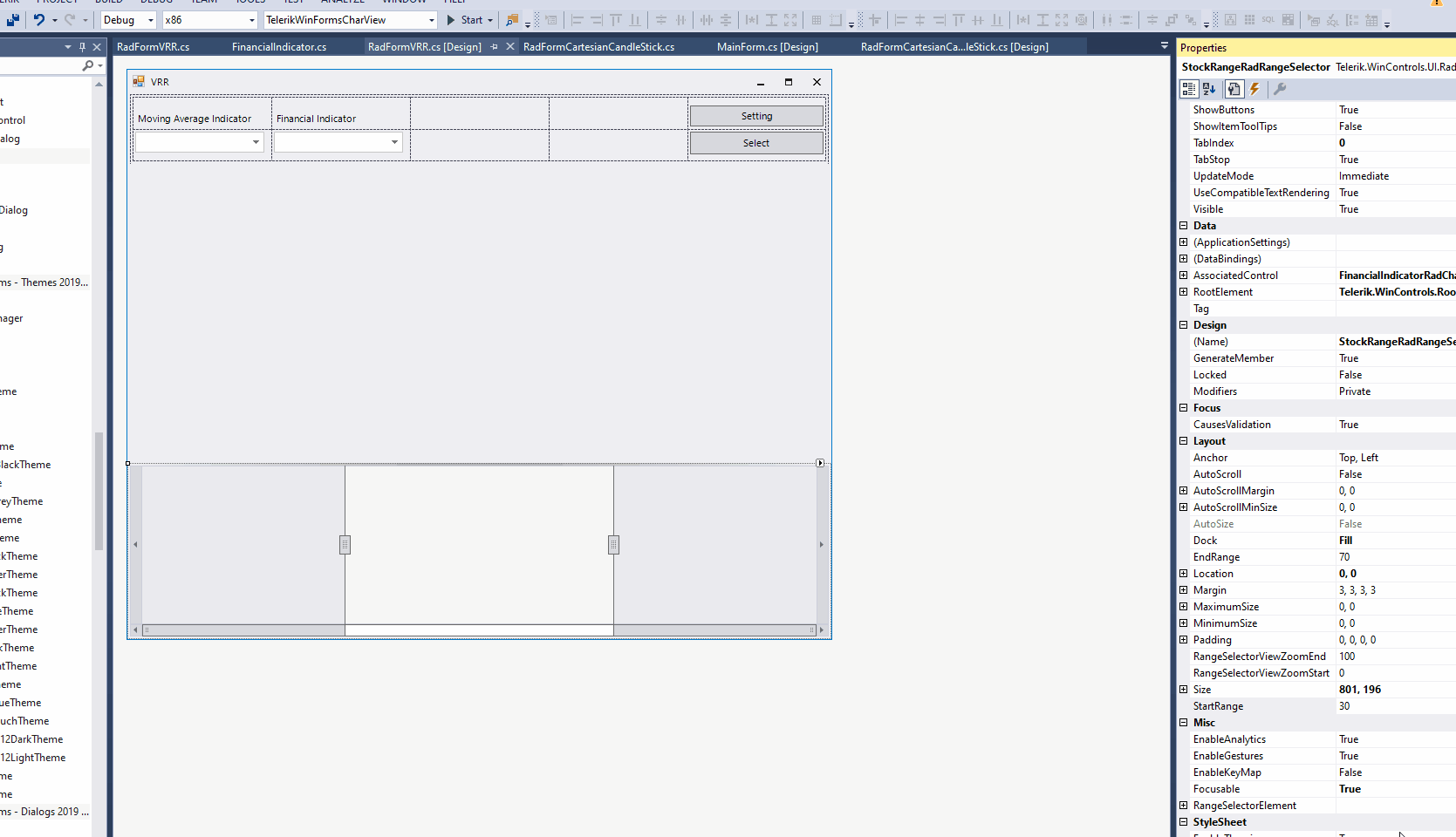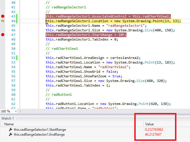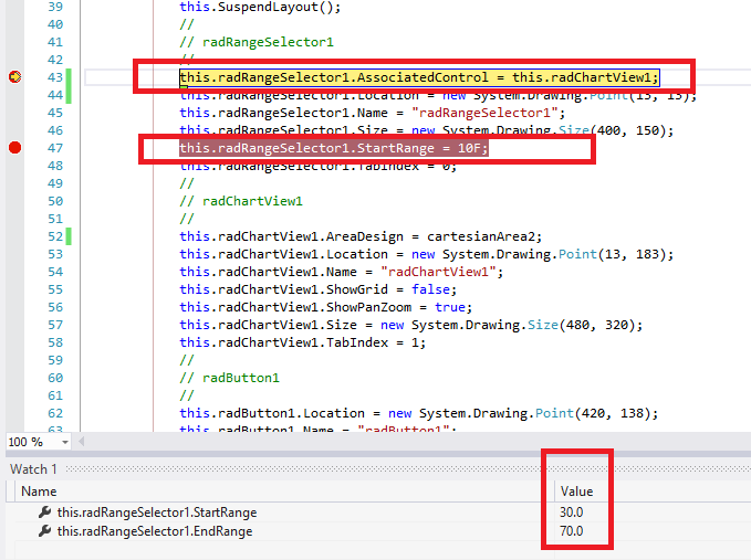 If I adjust the start/end range in RadRangeSelector at design time and associate it with a RadChartView at design time as well, the range gets adjusted in correspondence with the chart.