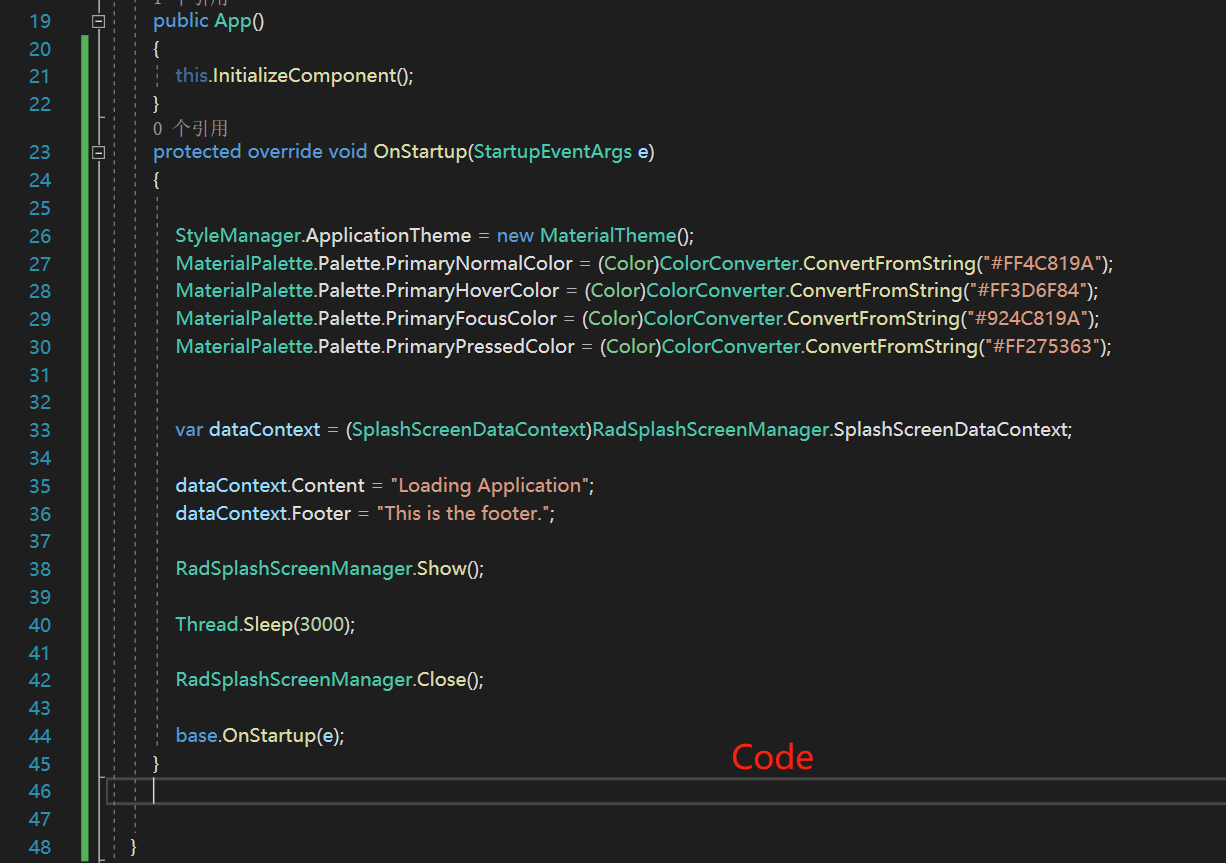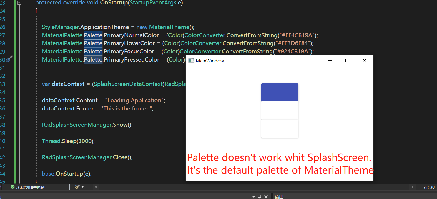 I choose the MaterialTheme for my window and it works as expected after changing my MaterialPalette.Palette . But after using the SplashScreen, the Palette setting seems to have failed.
