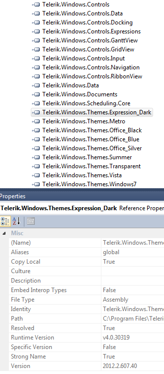 <telerik:RadWindow x:Class="Tools.Options" xmlns:telerik="http://schemas.telerik.com/2008/xaml/presentation" Header="Options" Height="273" MinHeight="273" MaxWidth="284" MinWidth="284" CanClose="False" IsTopmost="True" ResizeMode="CanResizeWithGrip" WindowStartupLocation="CenterOwner" Loaded="Window_Loaded"> <Grid></Grid></telerik:RadWindow>public partial class Options : RadWindow{}Every(controls) show the correct theming but the window frame and background do not. See attached images of the issue happening and my VS Project References.