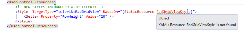 TargetType="telerik:RadGridView"> <Setter Property="AutoGenerateColumns" Value="False" /> <Setter Property="BorderThickness" Value="0" /> <Setter Property="BorderBrush" Value="Transparent" /> <Setter Property="ScrollViewer.HorizontalScrollBarVisibility" Value="Auto" /> <Setter Property="ScrollViewer.VerticalScrollBarVisibility" Value="Auto" /> <Setter Property="RowIndicatorVisibility" Value="Collapsed" /> <Setter Property="telerik:StyleManager.Theme" <!-- (2): appears to override all other setters -->