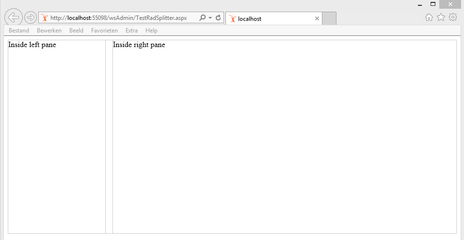 <%@ Page Language="vb" AutoEventWireup="false" CodeBehind="TestRadSplitter.aspx.vb" Inherits="WebwareNET.TestRadSplitter" %><%@ Register Assembly="Telerik.Web.UI" Namespace="Telerik.Web.UI" TagPrefix="telerik" %><!DOCTYPE html PUBLIC "-//W3C//DTD XHTML 1.0 Transitional//EN" "http://www.w3.org/TR/xhtml1/DTD/xhtml1-transitional.dtd"><html xmlns="http://www.w3.org/1999/xhtml"><head runat="server"> <title></title></head><body> <form id="form1" runat="server"> <telerik:RadScriptManager ID="RadScriptManager1" runat="server"> </telerik:RadScriptManager> <div> <telerik:RadSplitter ID="RadSplitter1" Width="100%" Height="100%" Orientation="Vertical" LiveResize="True" runat="server" Skin="MetroTouch"> <telerik:RadPane ID="LeftPane" MinWidth="200" Width="200" Scrolling="None" runat="server"> Inside left pane </telerik:RadPane> <telerik:RadSplitBar ID="RadSplitBar1" runat="server"> </telerik:RadSplitBar> <telerik:RadPane ID="RightPane" Scrolling="Both" runat="server"> Inside right pane </telerik:RadPane> </telerik:RadSplitter> </div> </form></body></html>And what we see in the browser can be seen in the attached screenshot.
