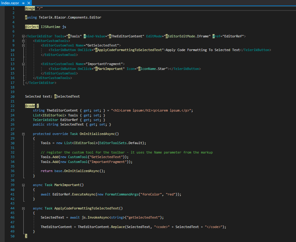 <TelerikButton OnClick="@GetSelectedText">Get selected text</TelerikButton>