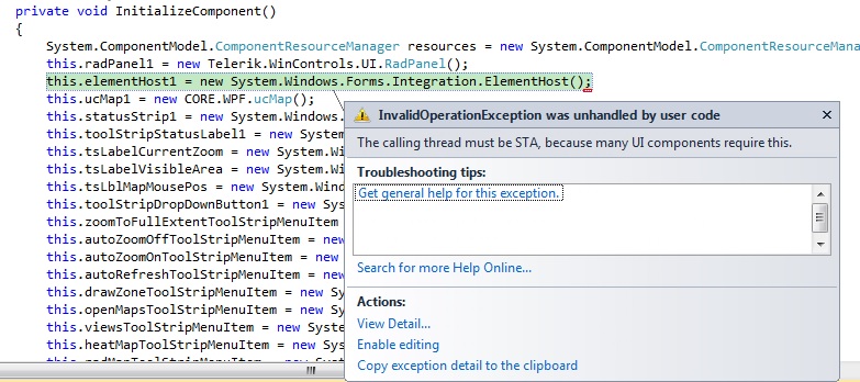 I'm calling WPF RadMap usercontrol inside Window form usercontrol using elementHost. But while calling using UI Virtualization it gives error as shown below.The below code work fine in standalone WPF usercontrol.