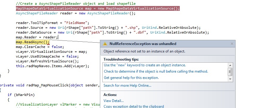 MapShapeDataVirtualizationSource map = new MapShapeDataVirtualizationSource(); AsyncShapeFileReader reader = new AsyncShapeFileReader(); reader.ToolTipFormat = "FieldName"; reader.Source = new Uri(rShape["path"].ToString() + ".shp", UriKind.RelativeOrAbsolute); reader.DataSource = new Uri(rShape["path"].ToString() + ".dbf", UriKind.RelativeOrAbsolute); map.Reader = reader; map.ReadAsync(); // Give the error .See the attached Error screen shot. map.ClearCache = false; vLayer.VirtualizationSource = map; vLayer.UseBitmapCache = false; vLayer.RefreshVirtualSource(); this.radMapNaveo.Items.Add(vLayer);The below code works.
