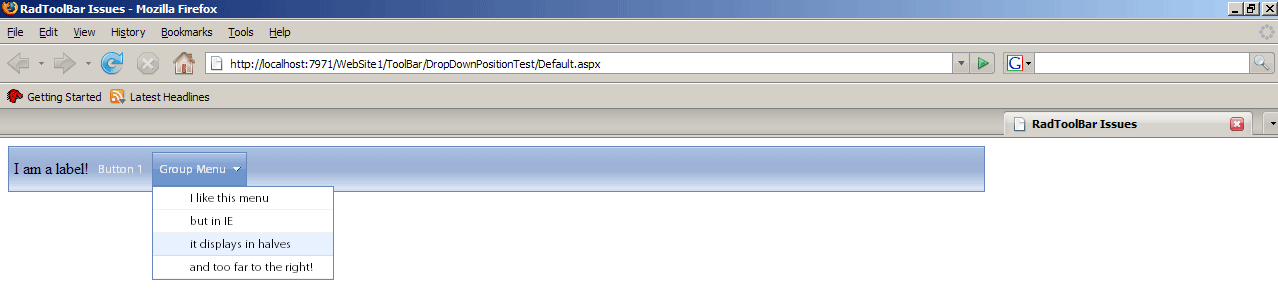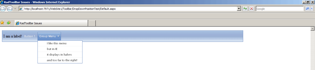 1. In IE7 the RadToolBarDropDown is displayed shifted to the right. In Firefox the menu displays directly underneath dropdown but in IE7 it is too far to the right.