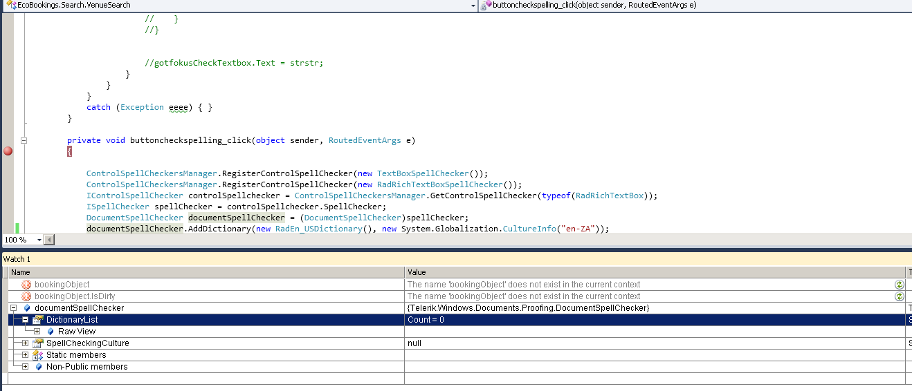 ControlSpellCheckersManager.RegisterControlSpellChecker(new TextBoxSpellChecker()); IControlSpellChecker controlSpellchecker = ControlSpellCheckersManager.GetControlSpellChecker(typeof(TextBox)); ISpellChecker spellChecker = controlSpellchecker.SpellChecker; DocumentSpellChecker documentSpellChecker = (DocumentSpellChecker)spellChecker; documentSpellChecker.AddDictionary(new RadEn_USDictionary(), new System.Globalization.CultureInfo("en-US"));As MEF couldn't load the ControlSpellCheckers the dictionary you mentioned remains empty, so you can fill it with the