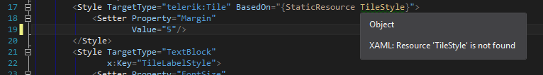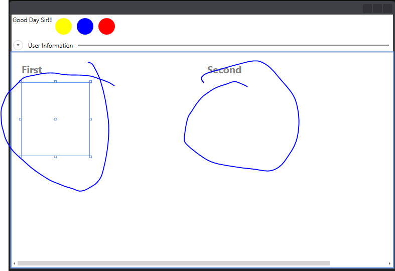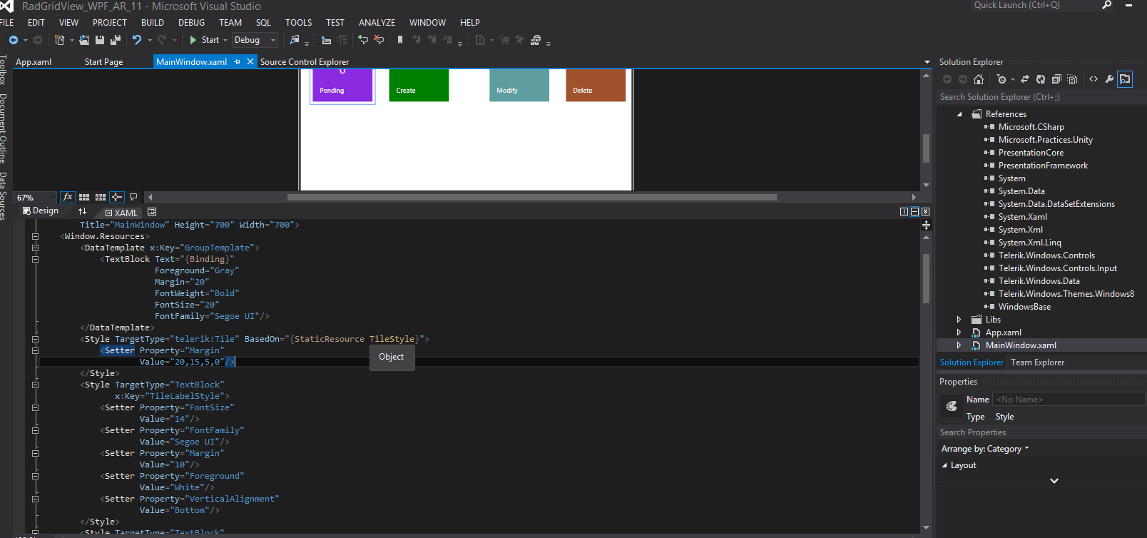 <Window x:Name="ShellWindow" x:Class="Green.ShellView" xmlns:telerik="http://schemas.telerik.com/2008/xaml/presentation" xmlns:cal="http://www.caliburnproject.org"> <Window.Resources> <DataTemplate x:Key="GroupTemplate"> <TextBlock Text="{Binding}" Foreground="Gray" Margin="20" FontWeight="Bold" FontSize="20" FontFamily="Segoe UI"/> </DataTemplate> <Style TargetType="telerik:Tile"> <Setter Property="Margin" Value="20,15,5,0"/> </Style> <Style TargetType="TextBlock" x:Key="TileLabelStyle"> <Setter Property="FontSize" Value="14"/> <Setter Property="FontFamily" Value="Segoe UI"/> <Setter Property="Margin" Value="10"/> <Setter Property="Foreground" Value="White"/> <Setter Property="VerticalAlignment" Value="Bottom"/> </Style> <Style TargetType="TextBlock" x:Key="LiveTileLabelStyle"> <Setter Property="FontSize" Value="24"/> <Setter Property="FontFamily" Value="Segoe UI"/> <Setter Property="Margin" Value="5"/> <Setter Property="Foreground" Value="White"/> <Setter Property="VerticalAlignment" Value="Center"/> <Setter Property="HorizontalAlignment" Value="Center"/> </Style> </Window.Resources> <telerik:RadDockPanel x:Name="LayoutRoot" LastChildFill="True"> <telerik:RadExpander x:Name="UserInfoContainer" ExpandDirection="Up" IsExpanded="True" telerik:RadDockPanel.Dock="Top"> <telerik:RadExpander.Header> <Grid HorizontalAlignment="Stretch"> <Grid.ColumnDefinitions> <ColumnDefinition Width="Auto"/> <ColumnDefinition Width="*"/> </Grid.ColumnDefinitions> <telerik:Label Content="User Information"/> <Rectangle Grid.Column="1" Height="2" Margin="5,0,0,0" VerticalAlignment="Center" Fill="Gray"/> </Grid> </telerik:RadExpander.Header> <telerik:RadExpander.Content> <StackPanel Orientation="Horizontal"> <TextBlock Text="Good Day Sir!!!"/> <Ellipse Width="33" Height="33" Margin="5" Fill="Yellow"/> <Ellipse Width="33" Height="33" Margin="5" Fill="Blue"/> <Ellipse Width="33" Height="33" Margin="5" Fill="Red"/> </StackPanel> </telerik:RadExpander.Content> </telerik:RadExpander> <telerik:RadTileList x:Name="AppLaunchPad" GroupTemplate="{StaticResource GroupTemplate}" ScrollViewer.HorizontalScrollBarVisibility="Visible" cal:Message.Attach="[Event SelectionChanged] = [Action OpenDoorway($eventArgs)]"> <telerik:Tile x:Name="PendingAuthTile" Background="BlueViolet" TileType="Single" Group="First"> <Grid> <TextBlock Text="Pending" Style="{StaticResource TileLabelStyle}"/> <TextBlock x:Name="PendingAuthCount" Text="0" Style="{StaticResource LiveTileLabelStyle}"/> </Grid> </telerik:Tile> <telerik:Tile x:Name="CreateAuthTile" Group="First" Background="Green" TileType="Single" cal:Message.Attach="[Event MouseDoubleClick] = [Action CreateAuth] "> <TextBlock Text="Create" Style="{StaticResource TileLabelStyle}"/> </telerik:Tile> <telerik:Tile x:Name="ModifyAuthTile" Group="Second" Background="CadetBlue" TileType="Single"> <TextBlock Text="Modify" Style="{StaticResource TileLabelStyle}"/> </telerik:Tile> <telerik:Tile x:Name="DeleteAuthTile" Group="Second" Background="Sienna" TileType="Single"> <TextBlock Text="Delete" Style="{StaticResource TileLabelStyle}"/> </telerik:Tile> </telerik:RadTileList> </telerik:RadDockPanel></Window>Thanks,