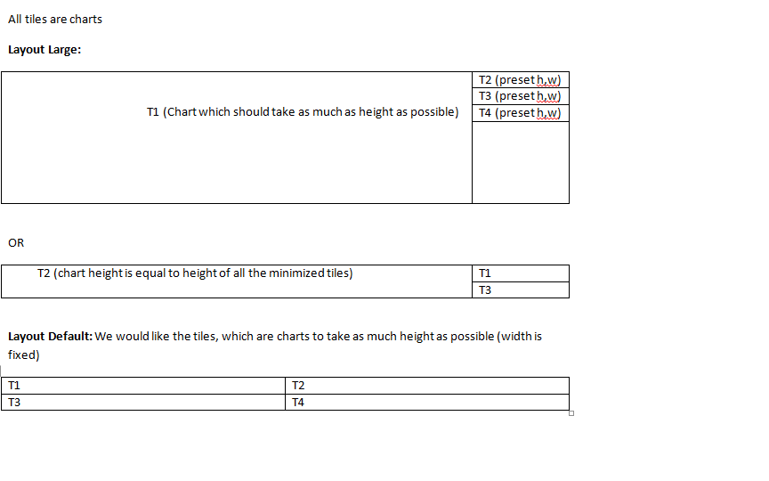 For example, based on user selection, bar chart in T1 might have lot of the data (lets say n bars) and hence will need to expand as much as possible, even if it means having a height beyond the minimized tiles.