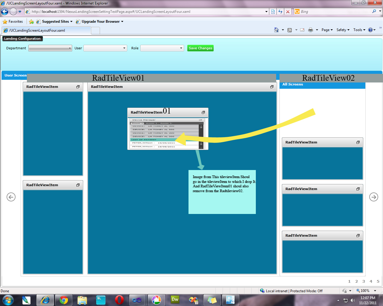public MainPage() { InitializeComponent(); DragDropManager.AddDropHandler(this.firstTileView, OnDrop); DragDropManager.AddDropHandler(this.SecondTileView, OnDrop); DragDropManager.AddDragInitializeHandler(this.SecondTileView, OnDragInitializedRadTileView); DragDropManager.AddDragInitializeHandler(this.firstTileView, OnDragInitializedRadTileView); DragDropManager.AddDragDropCompletedHandler(this.SecondTileView, OnDragFromListCompleted); DragDropManager.AddDragDropCompletedHandler(this.firstTileView, OnDragFromListCompleted);<telerik:RadTileView x:Name="firstTileView" BorderBrush="Green" BorderThickness="2"> <telerik:RadTileView.ItemContainerStyle> <Style TargetType="telerik:RadTileViewItem"> <Setter Property="telerik:DragDropManager.AllowDrag" Value="True" /> </Style> </telerik:RadTileView.ItemContainerStyle> </telerik:RadTileView>Petar Mladenov