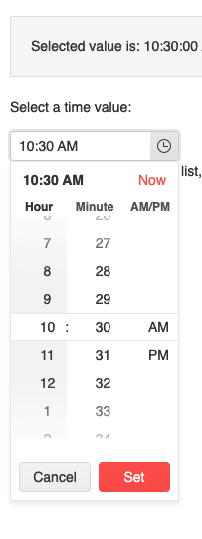 Thank you for explaining further. The design of the dropdown list containing the time options is as seen in the demos and the screenshot in my previous comment - by default there are two scrollable sections for choosing hour and minutes, and one for AM/PM. Depending on the set format, the dropdown may include scrollable sections for seconds and milliseconds too: