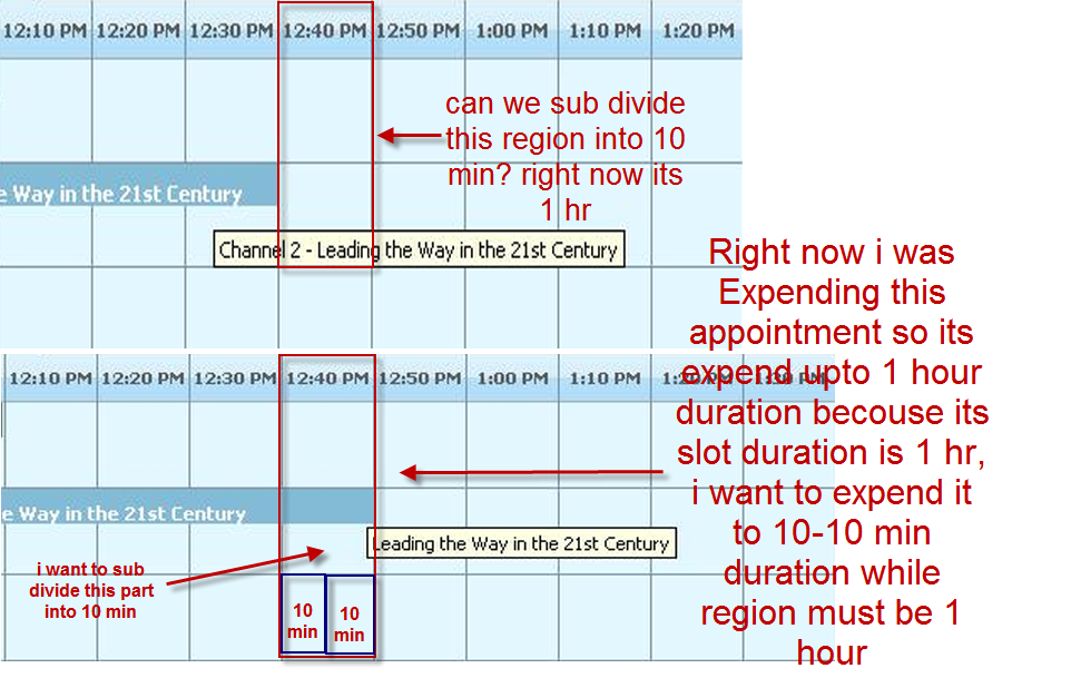 suppose we have 10 hour time slot and that have 10 regions of duration of 1 hour, so i want to sub divide this 1hour Time region into 6 parts of each 10 min, so that on Stretching of any appointment its duration will allow me to Stretch 10 min duration to Stretching not for 1 hour Stretching duration that is the default behaviour of Scheduler if i set 1 hour region.