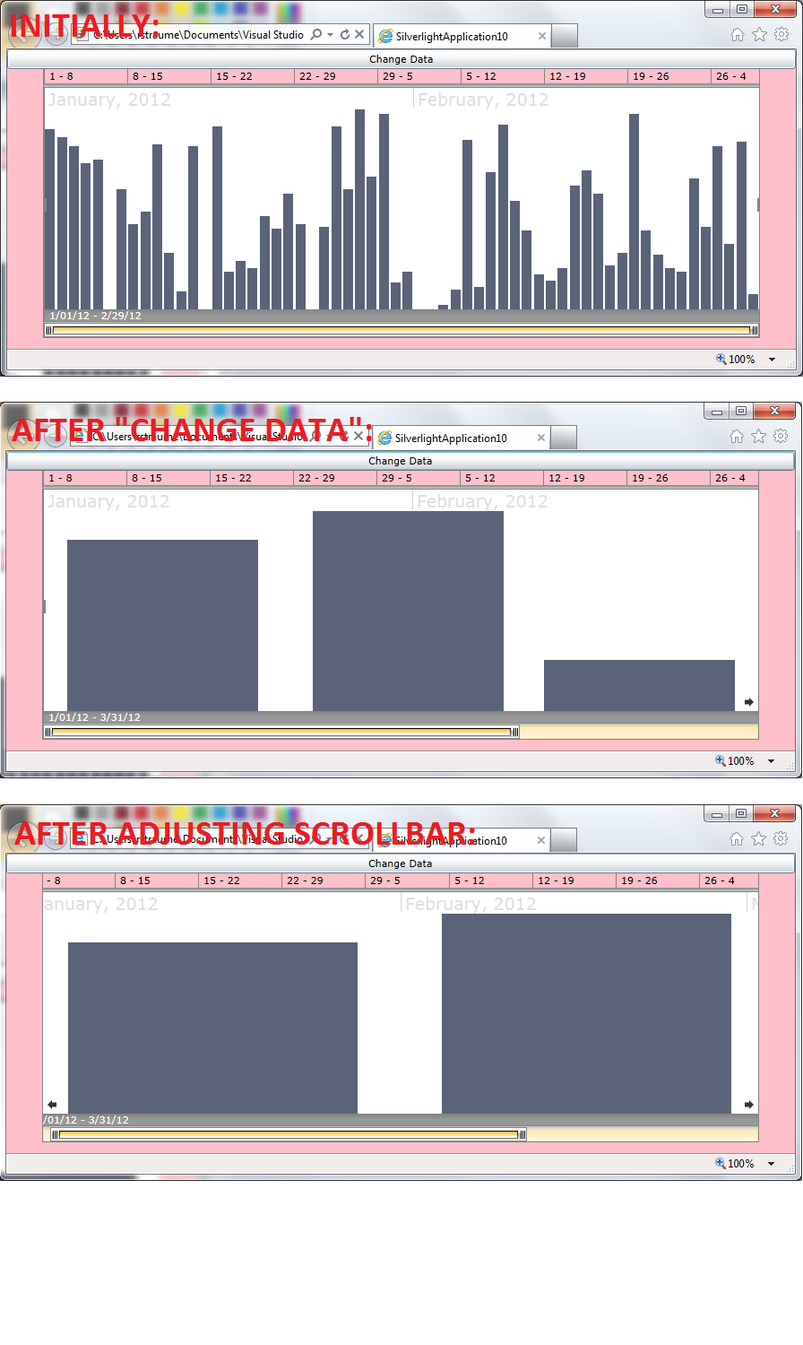 namespace SilverlightApplication10{ public partial class MainPage : UserControl { public VM vm = new VM(); public MainPage() { InitializeComponent(); this.Loaded += new RoutedEventHandler(MainPage_Loaded); } void MainPage_Loaded(object sender, RoutedEventArgs e) { vm.PeriodStart = new DateTime(2012, 1, 1); vm.PeriodEnd = new DateTime(2012, 3, 1); vm.IntervalType = IntervalType.Daily; this.DataContext = vm; } private void ChangeData(object sender, RoutedEventArgs e) { vm.IntervalType = vm.IntervalType == IntervalType.Daily ? IntervalType.Monthly : IntervalType.Daily; } } public enum IntervalType { Daily, Monthly } public class VM : Notify { private void RefreshDataPoints() { ObservableCollection<Point> p = new ObservableCollection<Point>(); Random r = new Random(); if (this.IntervalType == IntervalType.Daily) { this.PeriodEnd = new DateTime(2012, 3, 1); for (DateTime c = this.PeriodStart; c < this.PeriodEnd; c = c.AddDays(1)) { p.Add(new Point() { XValue = c, YValue = r.Next(0, 100) }); } } else { this.PeriodEnd = new DateTime(2012, 4, 1); p.Add(new Point() { XValue = new DateTime(2012, 1, 1), YValue = r.Next(0, 100) }); p.Add(new Point() { XValue = new DateTime(2012, 2, 1), YValue = r.Next(0, 100) }); p.Add(new Point() { XValue = new DateTime(2012, 3, 1), YValue = r.Next(0, 100) }); } this.Points = p; } private IntervalType _IntervalType = IntervalType.Daily; public IntervalType IntervalType { get { return this._IntervalType; } set { this._IntervalType = value; RaisePropertyChanged("IntervalType"); RefreshDataPoints(); } } private DateTime _PeriodStart = DateTime.MinValue; public DateTime PeriodStart { get { return this._PeriodStart; } set { this._PeriodStart = value; RaisePropertyChanged("PeriodStart"); RaisePropertyChanged("SelectionStart"); } } private DateTime _PeriodEnd = DateTime.MaxValue; public DateTime PeriodEnd { get { return this._PeriodEnd; } set { this._PeriodEnd = value; RaisePropertyChanged("PeriodEnd"); RaisePropertyChanged("SelectionEnd"); } } public DateTime SelectionStart { get { return this.PeriodStart; } } public DateTime SelectionEnd { get { return this.PeriodEnd; } } private ObservableCollection<Point> _Points = new ObservableCollection<Point>(); public ObservableCollection<Point> Points { get { return this._Points; } set { this._Points = value; RaisePropertyChanged("Points"); RaisePropertyChanged("MaxYValue"); } } public int MaxYValue { get { return (this.Points == null || this.Points.Count() == 0 ? 0 : this.Points.Max(itm => itm.YValue)); } } } public class Point : Notify { private DateTime _XValue = DateTime.MinValue; public DateTime XValue { get { return this._XValue; } set { this._XValue = value; RaisePropertyChanged("XValue"); } } private int _YValue = 0; public int YValue { get { return this._YValue; } set { this._YValue = value; RaisePropertyChanged("YValue"); } } } public class Notify : INotifyPropertyChanged { public event PropertyChangedEventHandler PropertyChanged; protected void RaisePropertyChanged(string propertyName) { PropertyChangedEventHandler propertyChanged = this.PropertyChanged; if ((propertyChanged != null)) { propertyChanged(this, new PropertyChangedEventArgs(propertyName)); } } }}