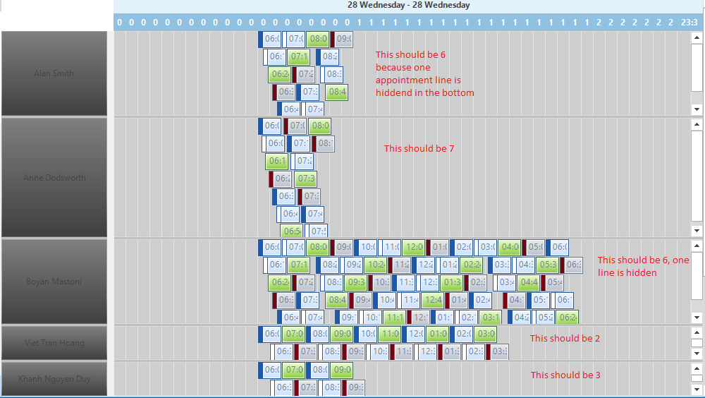 I am afraid this hasn't answered my question. I would like to have a way to know the number of lines of appointments that need to be displayed in the timeline view of each resource. With this information, I can adjust the height of each resource accordingly so that my user doesn't need to scroll to be able to see all of a resource's appointments.