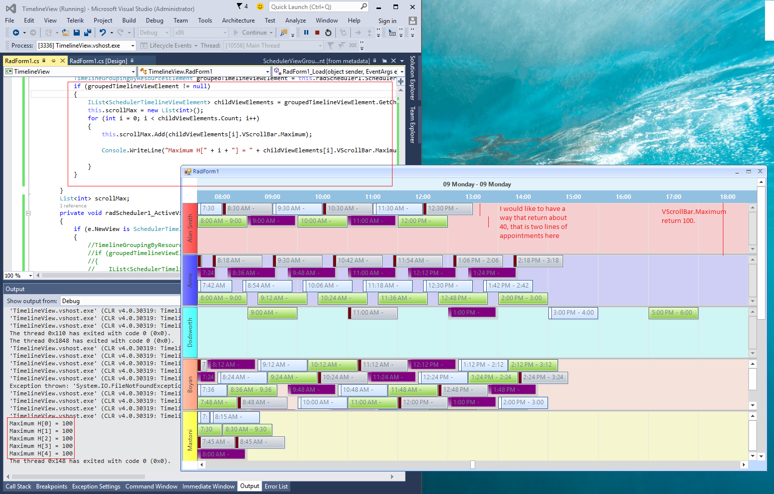 List<int> scrollMax;private void radScheduler1_ActiveViewChanged(object sender, SchedulerViewChangedEventArgs e){ if (e.NewView is SchedulerTimelineView) { TimelineGroupingByResourcesElement groupedTimelineViewElement = this.radScheduler1.SchedulerElement.ViewElement as TimelineGroupingByResourcesElement; if (groupedTimelineViewElement != null) { IList<SchedulerTimelineViewElement> childViewElements = groupedTimelineViewElement.GetChildViewElements(); this.scrollMax = new List<int>(); for (int i = 0; i < childViewElements.Count; i++) { this.scrollMax.Add(childViewElements[i].VScrollBar.Maximum); } } }}I hope this helps. Should you have further questions please do not hesitate to write back.