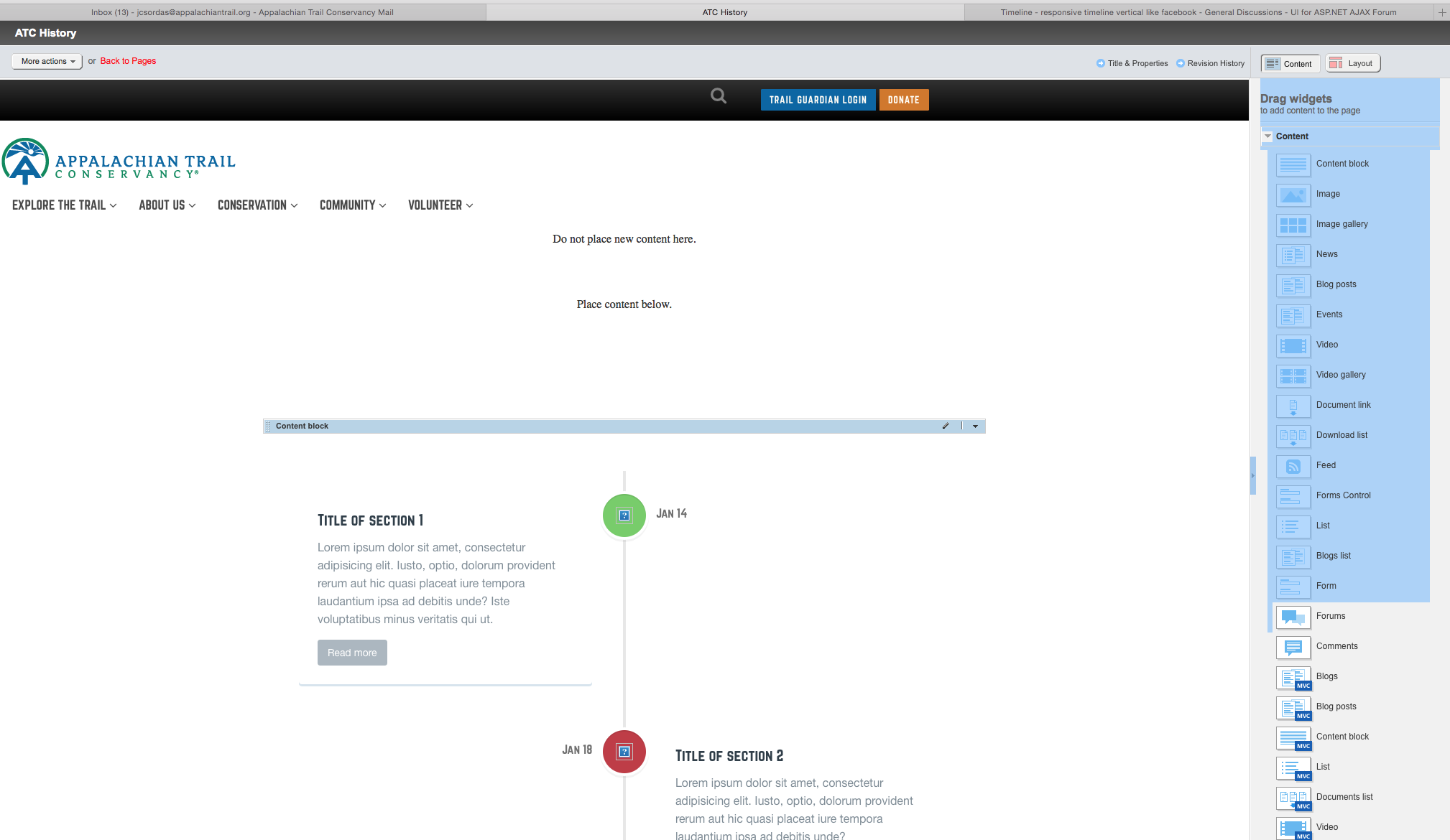 I have been trying to get the Cody House timeline (http://codyhouse.co/demo/vertical-timeline/index.html) to work in Sitefinity and the jquery seems to break the CMS. The widgets on the right can not be pulled, the top buttons in the backend disappear and the page is not functional.