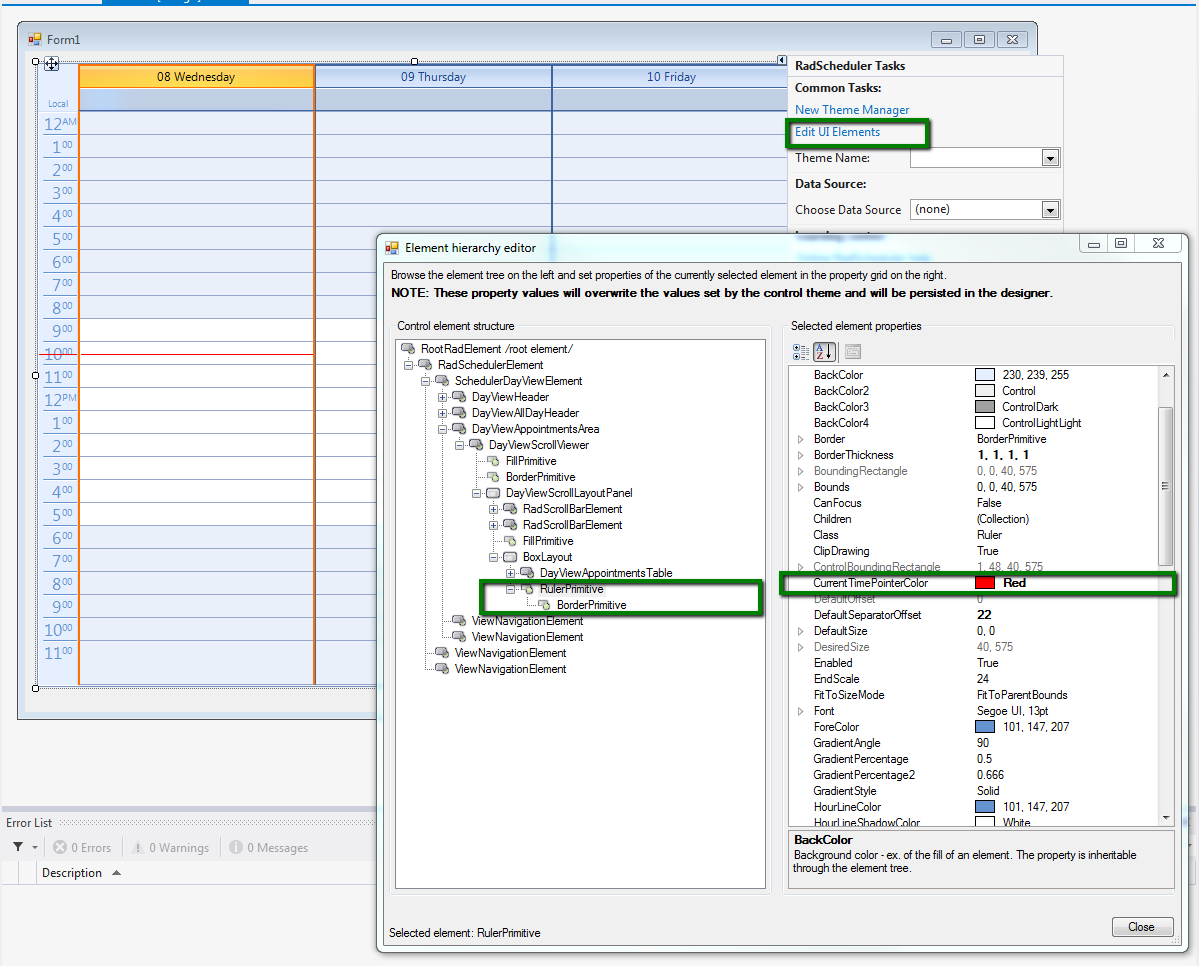 If you want to change the color of current time thumb, you need to click on 'Edit UI Elements' and change the value of the CurrentTimePointerColor property. I attached an image which demonstrates you how you find the property.