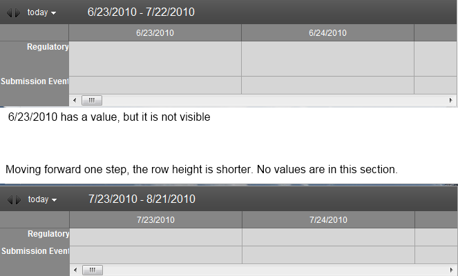 I have just one entry from a database being pulled for the actual timeline, for testing purposes. I cannot see the entry within the timeline. However, advancing the timeline forward shrinks the row height, making it appear that the data is pulled but is just not shown properly. I have attached a screenshot of this behavior.