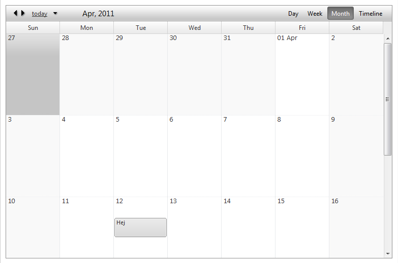 In the code below we set the height to 500px and for all other views that seems to be correct, for timeline its some other wiered height. And if we remove the height property the timeline view its always the same, if height is set or not. (Please see Month.png vs Timeline.png)