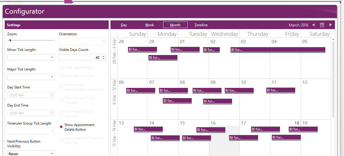 The main difference between this and the regular month view is that I want the events to be positioned on the calendar horizontally such that their position indicates their start and stop time.