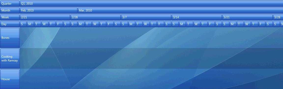 Is there a way to have scheduleView timeline group day day, week, month, quarter in a way that the user can specify the grouping they want. Attached is a proposed mockup of what i'm trying to accomplish.