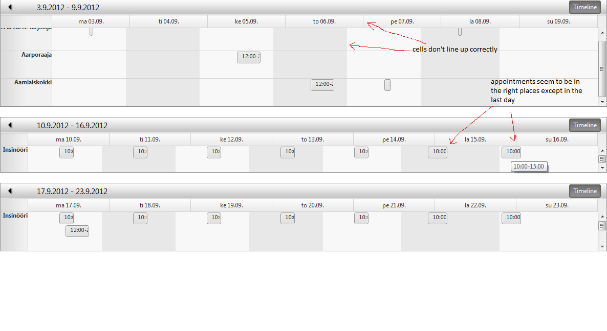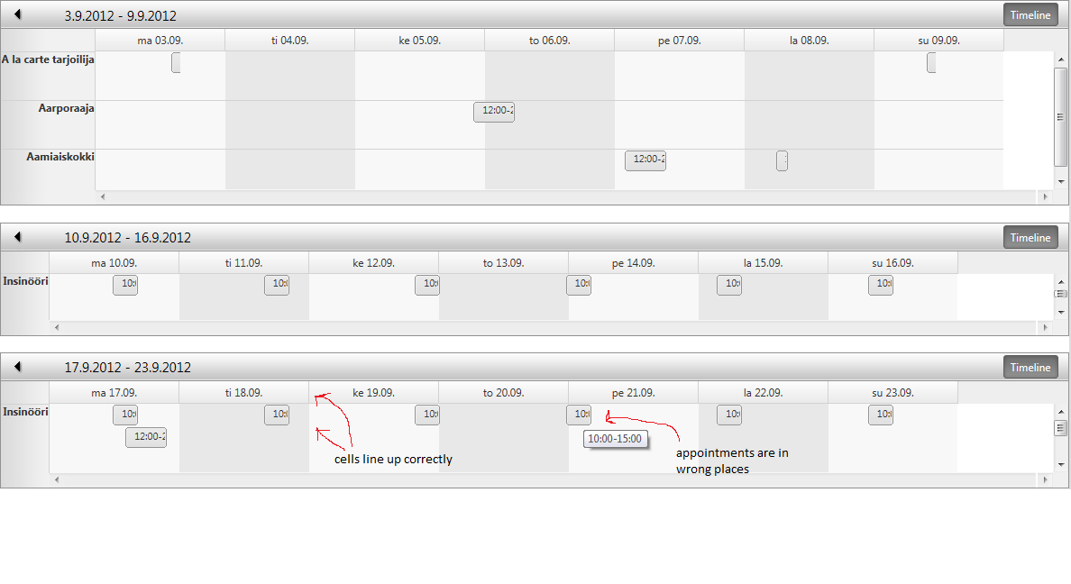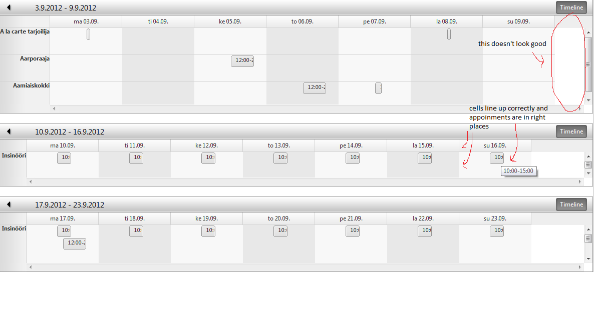 <telerik:RadScheduler runat="server" ID="scheduler" Height="100%" SelectedView="TimelineView" DataKeyField="ID" DataStartField="Alkuaika" DataEndField="Loppuaika" DataSubjectField="Loppuaika" CustomAttributeNames="Alkuaika, Loppuaika" DayView-UserSelectable="false" MonthView-UserSelectable="false" WeekView-UserSelectable="false" OnDataBound="dataBound" OnAppointmentClick="appointmentClick" OnAppointmentCreated="appointmentCreated" OnAppointmentDataBound="appointmentDataBound" OnTimeSlotCreated="timeSlotCreated" OnNavigationComplete="navigationComplete" AllowInsert="false" AllowEdit="false" AllowDelete="false" FirstDayOfWeek="Monday" LastDayOfWeek="Sunday" AppointmentStyleMode="Default" NumberOfHoveredRows="0" ColumnWidth="3px"> <TimelineView GroupBy="Ammattinimike" GroupingDirection="Vertical" SlotDuration="00:30:00" NumberOfSlots="336" ColumnHeaderDateFormat="ddd dd.MM." TimeLabelSpan="48"/> <AppointmentTemplate> <div> <%# Convert.ToDateTime(Eval("Start")).ToShortTimeString() %>-<%# Convert.ToDateTime(Eval("End")).ToShortTimeString() %> </div> </AppointmentTemplate> <ResourceTypes> <telerik:ResourceType DataSourceID="ds_Ammattinimike" ForeignKeyField="AmmattinimikeID" KeyField="ID" Name="Ammattinimike" TextField="Nimi" /> </ResourceTypes> </telerik:RadScheduler>I also have some screenshots to illustrate the problem.