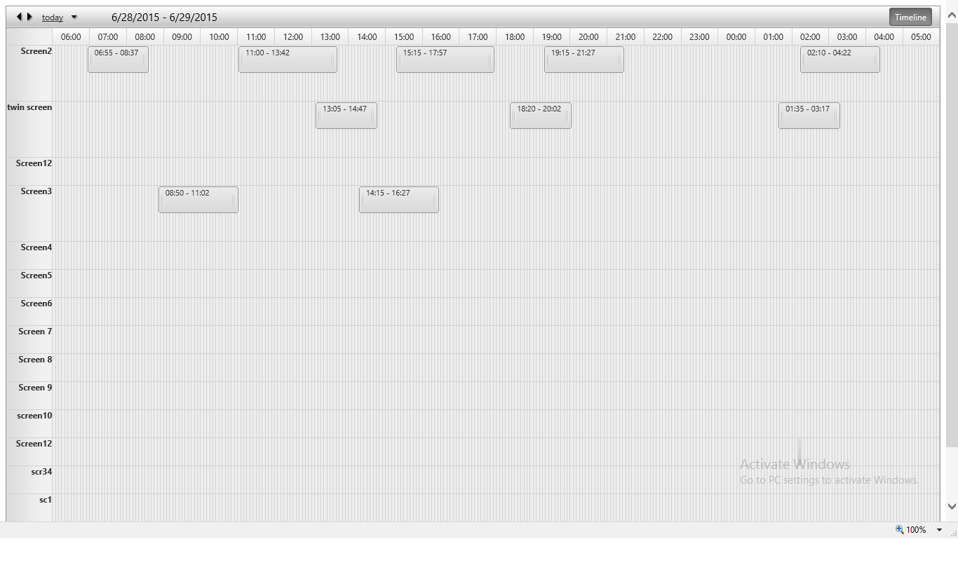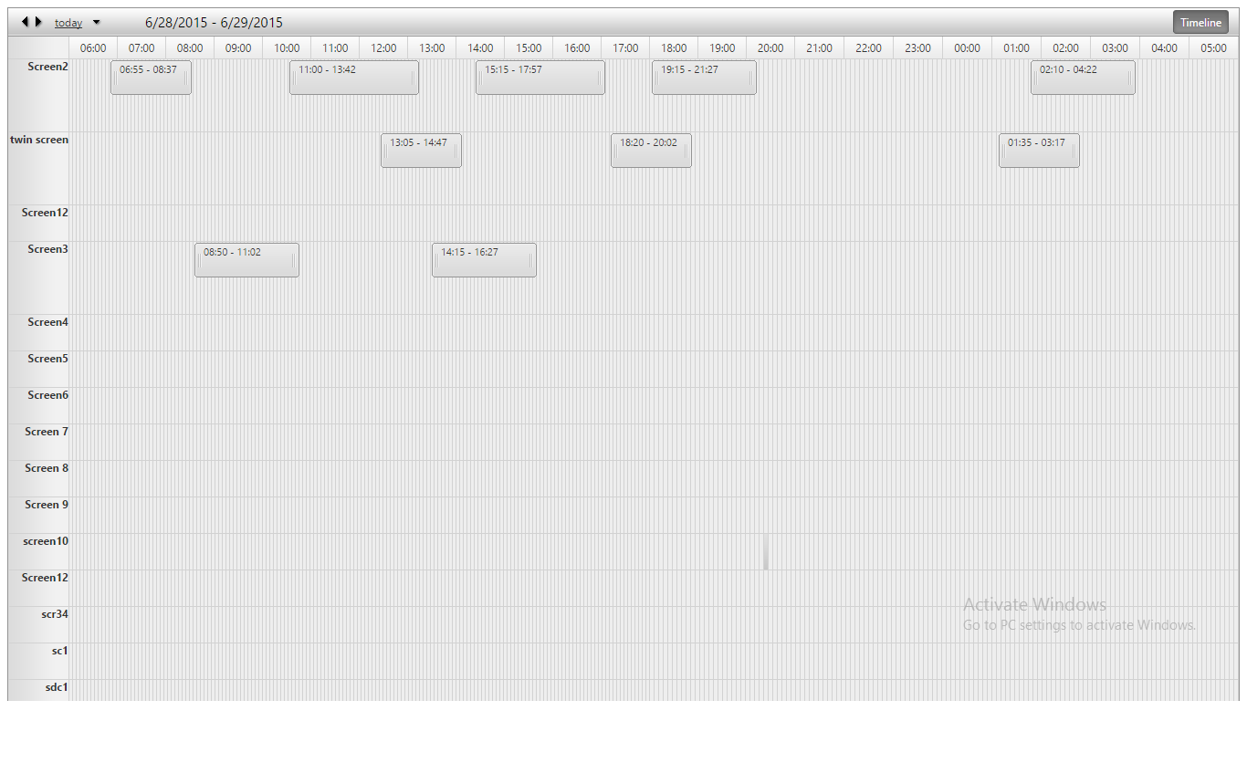 <telerik:RadScheduler runat="server" ID="schedulerdemo" DataKeyField="ScheduleId" DataSubjectField="ShowTime_From_To" DataDescriptionField="ShowTime_From_To" DayStartTime="06:00:00" DayEndTime="5:59:00" DataStartField="ScheduleDateTime" DataEndField="ScheduleEndTime" SelectedView="TimelineView" AllowEdit="true" AllowDelete="false" AllowInsert="true" RowHeight="40px"Skin="Default" OverflowBehavior="Expand" TimeSlotContextMenuSettings-EnableDefault="true"> <AdvancedForm Modal="false"></AdvancedForm> <MultiDayView UserSelectable="false"></MultiDayView> <TimelineView UserSelectable="true" GroupBy="ScreenName" GroupingDirection="Vertical" SlotDuration="00:05:00" EnableExactTimeRendering="true" TimeLabelSpan="12" StartTime="6:00:00" ColumnHeaderDateFormat="HH:mm" NumberOfSlots="288" ShowInsertArea="true"></TimelineView> <DayView UserSelectable="false" /> <WeekView UserSelectable="false" /> <MonthView UserSelectable="false" /> <AgendaView UserSelectable="false" /> <Localization ConfirmDeleteText="Do you want to delete this show?" ConfirmDeleteTitle="Delete" /></telerik:RadScheduler>We have isolated the issue and it seems to be caused by not correct slot calculation by Chrome browser itself. The only workaround that can be recommended is setting the ColumnWidth="7" of RadScheduler that will calculate the correct width and position all the appointments properly.