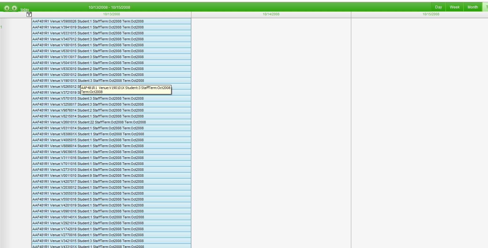 <telerik:RadScheduler ID="RadScheduler1" ColumnWidth="2000px" RowHeaderWidth="2000px" DayView-GroupingDirection="Vertical" RowHeaderHeight="500px" runat="server" DataSourceID="SqlDataSource2" DataEndField="ENDDATE" DataKeyField="ID" Skin="Telerik" DataSubjectField="SUBJECTS" DataStartField="STARTDATE" AllowDelete="False" AllowEdit="False" AllowInsert="False" DayEndTime="20:00:00" OverflowBehavior="Expand" SelectedView="MonthView" OnDataBound="RadScheduler1_DataBound" OnAppointmentCreated="RadScheduler1_AppointmentCreated" CssClass="ConfigurationPanel1" OnTimeSlotCreated="RadScheduler1_TimeSlotCreated" OnAppointmentDataBound="RadScheduler1_AppointmentDataBound" GroupingDirection="Vertical" EnableViewState="False" DisplayDeleteConfirmation="False" EnableAdvancedForm="False" EnableResourceEditing="False" ReadOnly="True" MinutesPerRow="60" OnAppointmentCommand="RadScheduler1_AppointmentCommand"> <TimelineView GroupBy="SESS" GroupingDirection="Vertical" /> <ResourceTypes> <telerik:ResourceType KeyField="SESS" Name="SESS" TextField="SESS" ForeignKeyField="SESS" DataSourceID="SqlDataSource2" /> </ResourceTypes> <DayView GroupingDirection="Vertical" /></telerik:RadScheduler>and the Sqldatasource is defined as follows