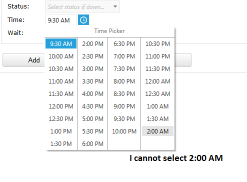 I have a time picker control that allows me to pick a time from a set of business hours. Normally, those hours run from around 9AM until (at the latest) 10PM. Since the times appear within the same day, there is no problem. Occasionally, however, our business hours go until around 3AM.