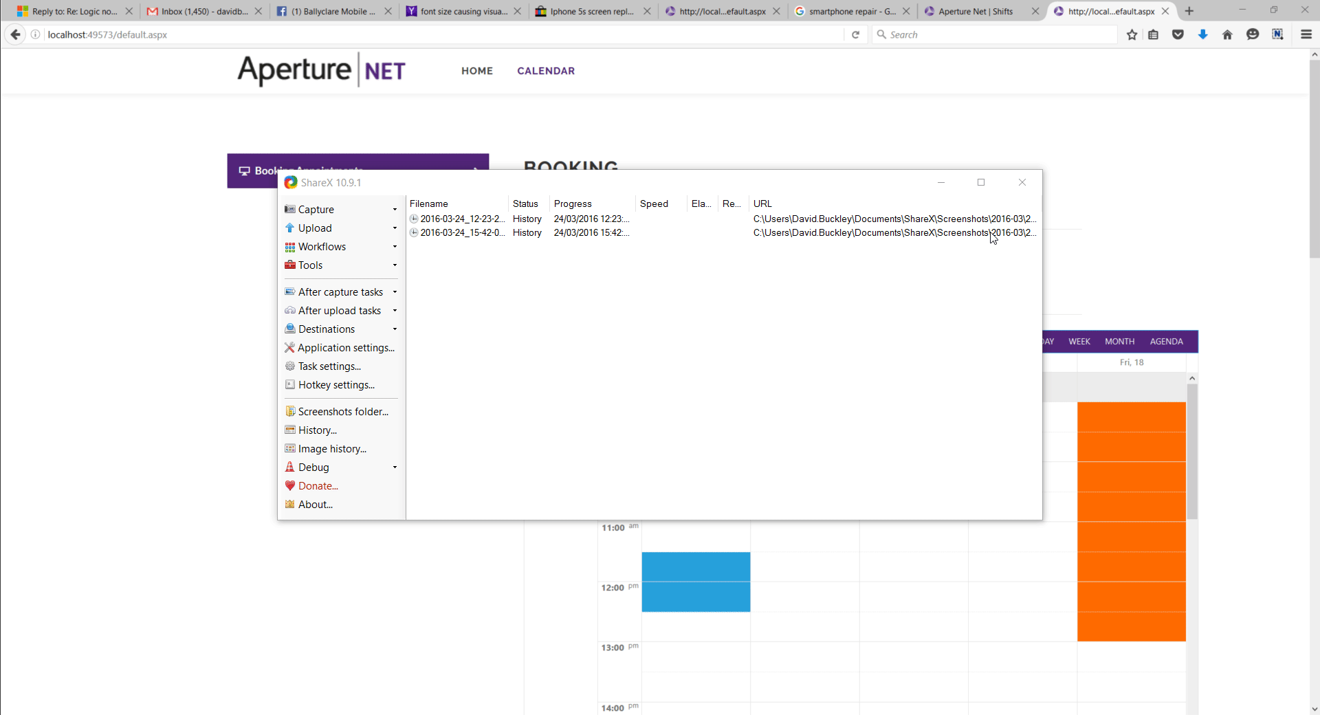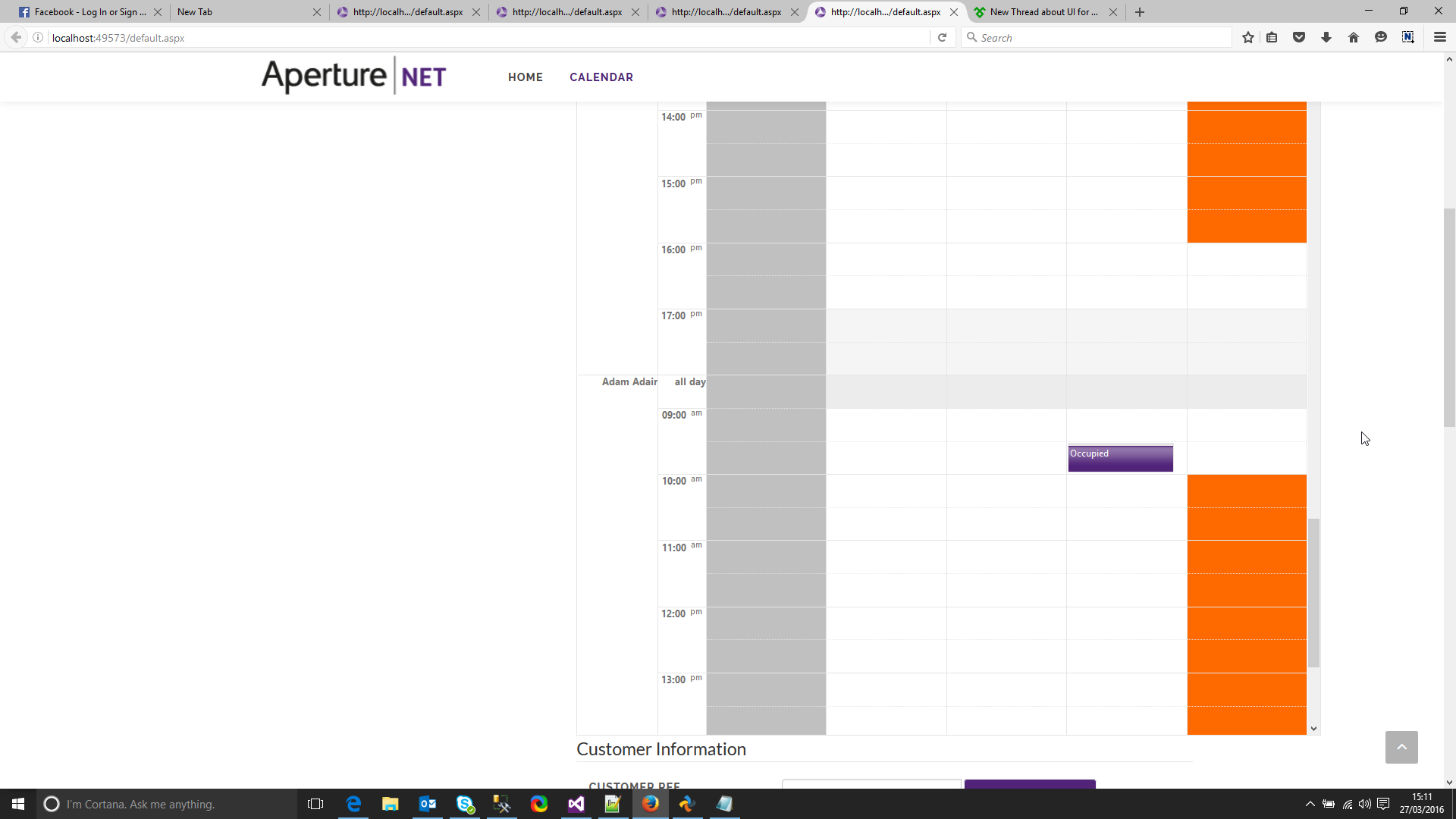 01./// <param name="e">The <see cref="TimeSlotCreatedEventArgs"/> instance containing the event data.</param>02. protected void apertureAppointments_TimeSlotCreated(object sender, TimeSlotCreatedEventArgs e)03. {04. foreach (DateTime dt in SpecialDays)05. 06. {07. if (DateTime.Compare(e.TimeSlot.Start.Date, dt) == 0)08. {09. //Set the CssClass property to visually distinguish your special days.10. e.TimeSlot.CssClass = "Disabled";11. }12. 13. 14. 15. 16. }17. 18. 19. List<Resource> resources = new List<Resource>(apertureAppointments.Resources.GetResourcesByType("Managers"));20. Resource res = resources[5];21. 22. DateTime dt1 = DateTime.Parse("2016/03/25 10:00");23. DateTime dt2 = DateTime.Parse("2016/03/25 16:00");24. if (res.Text == "Adam Adair")25. {26. if (DoDateRangesOverlap(e.TimeSlot.Start, e.TimeSlot.End, dt1, dt2))27. {28. e.TimeSlot.CssClass = "UnavailableCssStyle";29. }30. }31. }