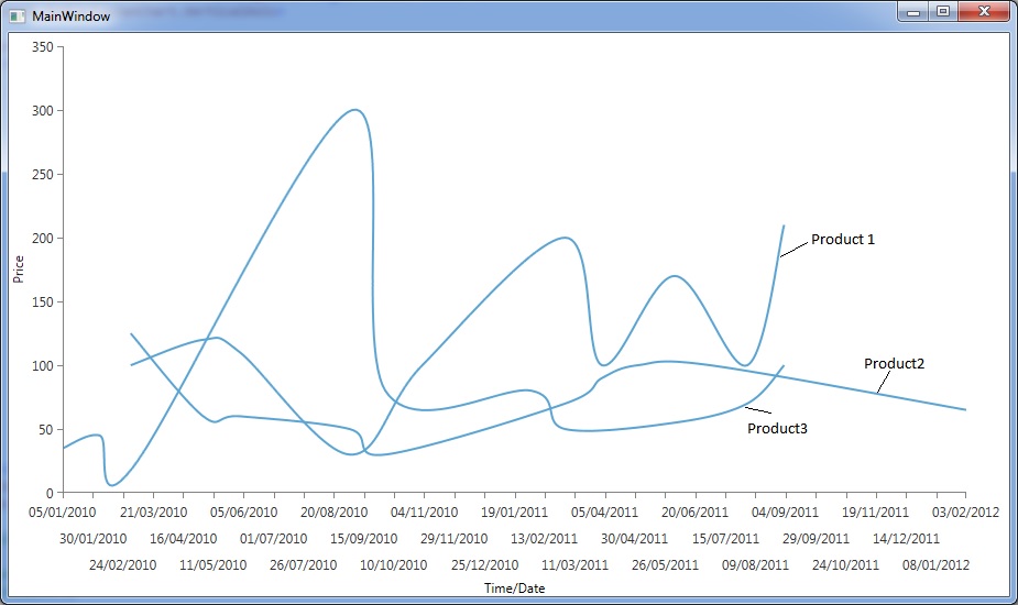 <Window x:Class="RadCartesianChartWithNamedMultipleLines.MainWindow"<br> xmlns="http://schemas.microsoft.com/winfx/2006/xaml/presentation"<br> xmlns:x="http://schemas.microsoft.com/winfx/2006/xaml"<br> xmlns:telerik="http://schemas.telerik.com/2008/xaml/presentation"<br> Title="MainWindow" Height="550" Width="925"><br> <Window.Resources><br> <telerik:ChartPalette x:Key="customPalette"><br> <telerik:ChartPalette.SeriesEntries><br><br> <telerik:PaletteEntryCollection SeriesFamily="Pie"><br> <telerik:PaletteEntry Fill="#FF1FAFD3" Stroke="White"/><br> <telerik:PaletteEntry Fill="#FFC32E0A" Stroke="White"/><br> <telerik:PaletteEntry Fill="#FFFA6F5E" Stroke="White"/><br> </telerik:PaletteEntryCollection><br> <telerik:PaletteEntryCollection SeriesFamily="Bar"><br> <telerik:PaletteEntry Fill="#FF006968" Stroke="White"/><br> <telerik:PaletteEntry Fill="#FF7A6CC4" Stroke="White"/><br> <telerik:PaletteEntry Fill="#FF1FAFD3" Stroke="White"/><br> </telerik:PaletteEntryCollection><br> </telerik:ChartPalette.SeriesEntries><br><br> <telerik:ChartPalette.GlobalEntries><br> <telerik:PaletteEntry Fill="#FF21B573" Stroke="White" /><br> <telerik:PaletteEntry Fill="#FF88CA2A" Stroke="White" /><br> <telerik:PaletteEntry Fill="#FFFF921E" Stroke="White" /><br> </telerik:ChartPalette.GlobalEntries><br><br> </telerik:ChartPalette><br> </Window.Resources><br> <Grid ><br> <Grid.ColumnDefinitions><br> <ColumnDefinition Width="*" /><br> <ColumnDefinition Width="5" /><br> <ColumnDefinition Width="Auto" /><br> </Grid.ColumnDefinitions><br><br> <telerik:RadCartesianChart x:Name="RadCartesianChart" Palette="{StaticResource customPalette}" HorizontalAlignment="Stretch"><br> <telerik:RadCartesianChart.HorizontalAxis><br> <telerik:DateTimeContinuousAxis LabelFitMode="MultiLine" Title="Time/Date"<br> LabelFormat="dd/MM/yyyy" /><br> </telerik:RadCartesianChart.HorizontalAxis><br><br> <telerik:RadCartesianChart.VerticalAxis><br> <telerik:LinearAxis HorizontalAlignment="Right" Title="Price" /><br> </telerik:RadCartesianChart.VerticalAxis><br><br> <telerik:RadCartesianChart.SeriesProvider><br> <telerik:ChartSeriesProvider Source="{Binding Path=Products}"><br> <telerik:ChartSeriesProvider.SeriesDescriptors><br><br> <telerik:CategoricalSeriesDescriptor ItemsSourcePath="Prices"<br> ValuePath="Value"<br> CategoryPath="DateTime"><br> <telerik:CategoricalSeriesDescriptor.Style><br> <Style TargetType="{x:Type telerik:SplineSeries}"><br> <Setter Property="ShowLabels" Value="False" /><br> <Setter Property="LegendSettings"><br> <Setter.Value><br> <telerik:SeriesLegendSettings Title="{Binding Path=Name}" /><br> </Setter.Value><br> </Setter><br> </Style><br> </telerik:CategoricalSeriesDescriptor.Style><br> </telerik:CategoricalSeriesDescriptor><br> </telerik:ChartSeriesProvider.SeriesDescriptors><br> </telerik:ChartSeriesProvider><br> </telerik:RadCartesianChart.SeriesProvider><br> </telerik:RadCartesianChart><br><br> <ScrollViewer Grid.Column="2" HorizontalScrollBarVisibility="Auto"<br> VerticalScrollBarVisibility="Auto" Width="200"><br> <telerik:RadLegend Items="{Binding ElementName=RadCartesianChart, Path=LegendItems}" /><br> </ScrollViewer><br> </Grid><br></Window>What is wrong?