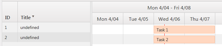 I have a simple list of tasks, and none of them are summary tasks. The titles of the tasks are displayed correctly in the bars in the calendar, but the title that appears in the task list is "undefined". I have attached a screenshot. My Razor view is enclosed below.