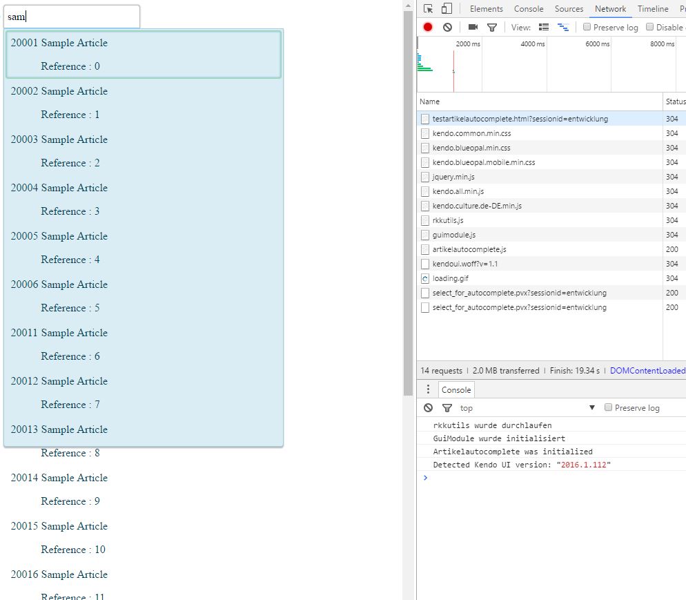 01.guimodule.artikelautocomplete = (function () {02. 03. 04. var dsArtikel = new kendo.data.DataSource({05. 06. type: "json",07. pageSize: 20,08. transport: {09. read: {11. type: "post",12. dataType: "json"13. }14. }15. });16. 17. var artikelac = $("#artikelautocomplete").kendoAutoComplete({18. template: "<table><tr><td>"+19. "# var bez = data.b.split('|')##: data.n #</td><td>#: bez[0] #</td><tr>"+20. 21. "<tr><td></td><td>#:bez[1]#</td></tr>"+22. "</table>",23. dataSource: dsArtikel,24. height: 600,25. 26. filter: "contains",27. highlightFirst: true,28. dataTextField: "b"29. }).data("kendoAutoComplete");30. 31. //32. artikelac.list.width(400);33. 34. 35. 36. 37.console.log("Artikelautocomplete was initialized");38. 39.return {}40. 41. 42.}());