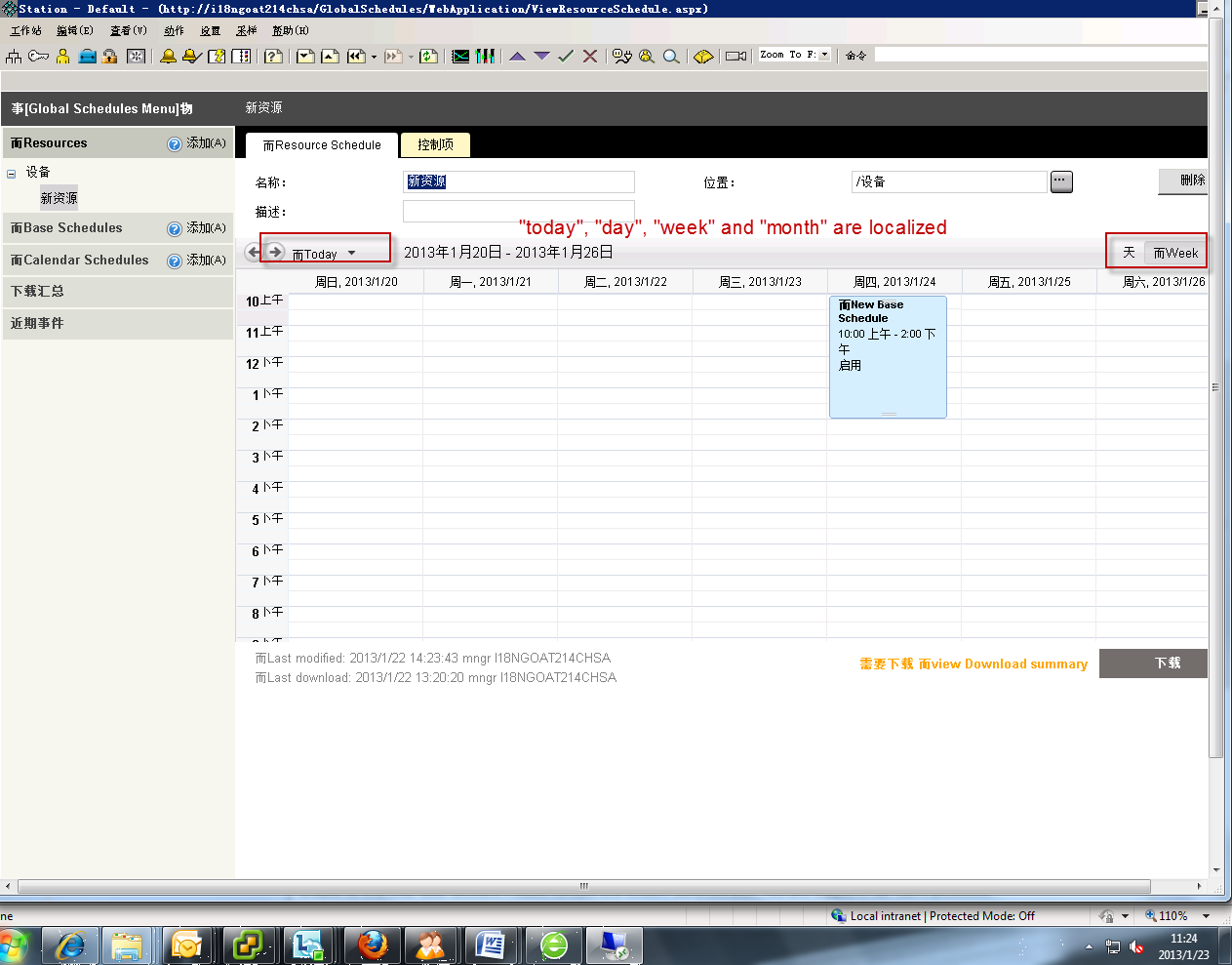 we have wrote the localized codes for strings "today", "day", "week" and "month" shown in radscheduler control,and the strings will be read from database to get the localized strings. for example: _view.ResourceScheduler.Localization.AdvancedCalendarCancel = I18N.Tag("Cancel");