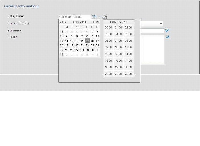 <telerik:RadDateTimePicker runat="server" ID="RadDateTimePicker1"><TimePopupButton Visible="false" /><ClientEvents OnPopupOpening="showPopUpAbove" /></telerik:RadDateTimePicker><telerik:RadCodeBlock runat="server"><script type="text/javascript"> var flag = 0; function showPopUpAbove(sender, args) { if (flag == 0) { flag = 1; args.set_cancel(true); var picker = sender; var textBox = picker.get_textBox(); var popupElement = null; if (picker.get_popupContainer()) { popupElement = picker.get_popupContainer(); } else { popupElement = picker.get_timePopupContainer(); } var dimensions = picker.getElementDimensions(popupElement); var position = picker.getElementPosition(textBox); picker.showPopup(); picker.showTimePopup(position.x + 200, position.y - dimensions.height + 200); } else { flag = 0; } } Telerik.Web.UI.RadDateTimePicker.prototype.showTimePopup = function (x, y) { this._setUpTimeView(); if (this.isTimePopupVisible()) return; this.get__TimePopup().ExcludeFromHiding = this.get__TimePopupVisibleControls(); this.hideTimePopup(); var args = new Telerik.Web.UI.DatePickerPopupOpeningEventArgs(this.get_timeView(), false); this.raise_popupOpening(args); if (args.get_cancel() == true) { return; } if (this.get_dateInput()._hiddenElement.value) { var rawTime = this.get_dateInput()._hiddenElement.value.split("-"); this.get_timeView()._selectTimeCell(parseInt(rawTime[3], 10), parseInt(rawTime[4], 10)); } if (this._animationSettings.HideAnimationDuration > 0) this.get_timeView()._clearHovers(); this.get__TimePopup().Opener = this; this.get__TimePopup().Show(x, y, this.get_timePopupContainer()); }</script>Additionally please note that this is not a supported scenario.