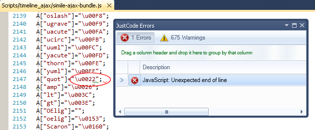 But, look to the attachment. There is a strange JustCode-Error in a third-party js-file (simile-ajax-bundle.js).