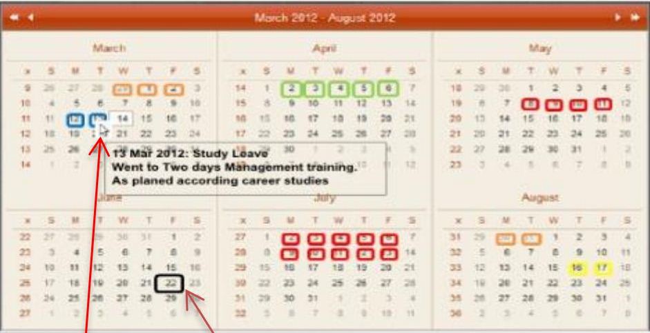- Custom comments for the day should be shown in tool tip (eg. If I've applied leave for the upcoming day it should be shown in some color (red) and if i place the mouse over it, the reason for the leave should show in tool tip)