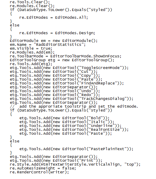 I create the RadEditor in CodeBehind and setup the properties as required. On the output page the Editor appears and all looks fine.However when I click inside the Editor (set to ShowOnFocus) I get a Javascript error and a blank Toolbar. This happens in IE8 and FireFox 8.0.1