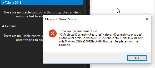 I actually did try this before I created this post. I browsed to the assemblies that were brought down to my packages directories after referencing the nuget packages. Unfortunately I get the "there are no components … that can be placed on the toolbox" message. In the attached message I was trying to add one of the Themes DLLs.