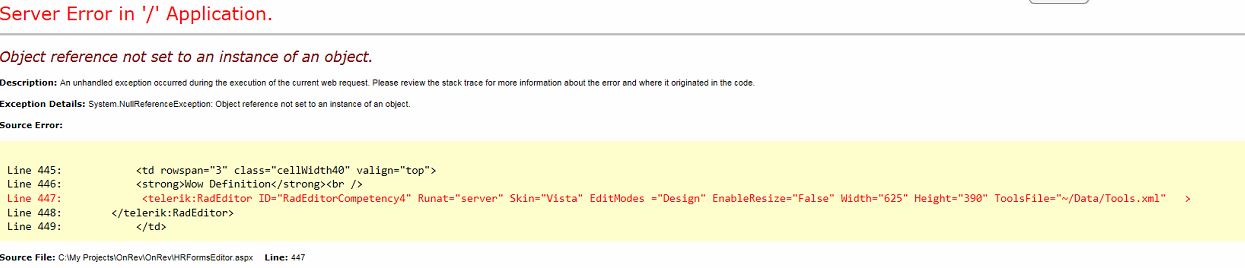 My radeditor was working fine until i updated to the latest Telerik Ajax. Now I keep getting: "Object Reference not set to an instance of an object.". This error will go away if i remove the attribute toolfile in radeditor control. Please let me know why it is behaving like this. Thank you
