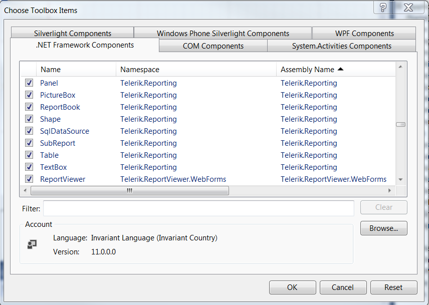 Only the toolbox items for the newest version of Telerik Reporting installed on the machine will be available inside the Visual Studio Toolbox.