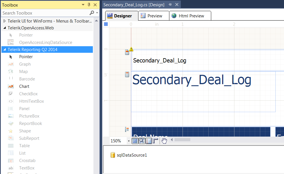 In case you have installed Q1 2015 SP1, you won't be able to use the VS Toolbox items of Telerik Reporting Q2 2014, which is the version shown in the attached toolbox.png screenshot.