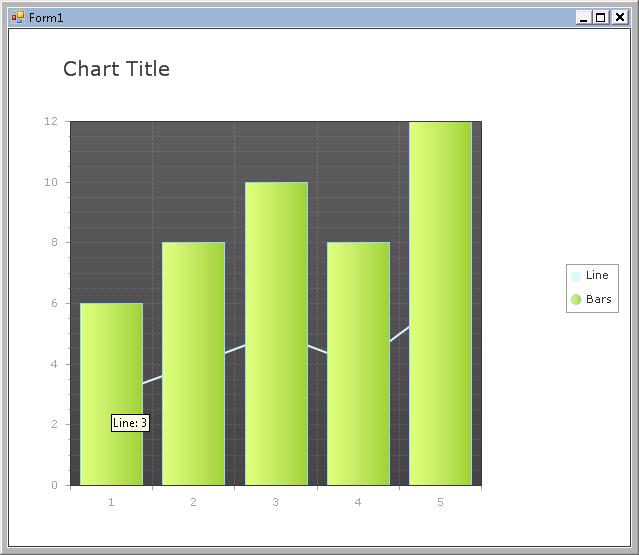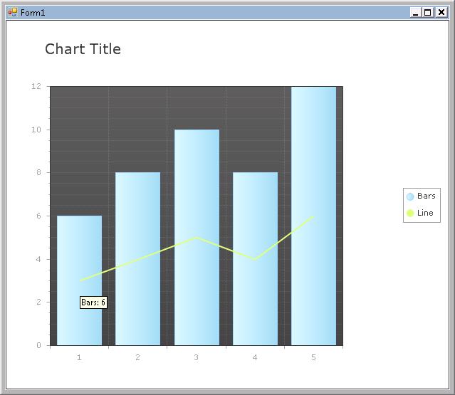 using System.Windows.Forms; using Telerik.Charting; using Telerik.WinControls.UI; namespace ChartTest { public partial class Form1 : Form { public Form1() { InitializeComponent(); radChart1.Series.Clear(); ChartSeries s1 = new ChartSeries("Bars", ChartSeriesType.Bar); s1.Appearance.ShowLabels = false; radChart1.Series.Add(s1); ChartSeries s2 = new ChartSeries("Line", ChartSeriesType.Line); s2.Appearance.PointMark.Visible = true; s2.Appearance.ShowLabels = false; radChart1.Series.Add(s2); double[] values = new double[] { 6, 8, 10, 8, 12 }; foreach (double v in values) { ChartSeriesItem item1 = new ChartSeriesItem(v); item1.ActiveRegion.Tooltip = "Bars: " + item1.YValue.ToString(); s1.Items.Add(item1); ChartSeriesItem item2 = new ChartSeriesItem(v / 2); item2.ActiveRegion.Tooltip = "Line: " + item2.YValue.ToString(); s2.Items.Add(item2); } radChart1.Refresh(); } } }The Bars series is added before the Line one. This allows to show the line in front of bars. But the tooltip of the Bars series override the tooltip of the Line one. See attached img1.jpg.