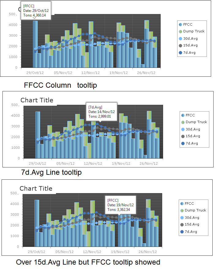 The Bars series is added before the Line one. This allows to show the line in front of bars. But the tooltip of the Bars series override the tooltip of the Line one. See attached img1.jpg.