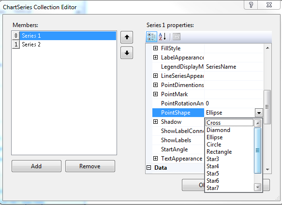 I am drawing a multiseries line chart. I want to hide series point lables and display some point shape instead (like star,triangle,cross etc). When mouse is hovered on the data points it should display value in tooltip. How can I do this using RadChart?