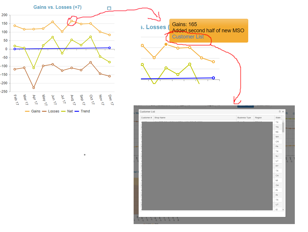 Open to suggestions if there is a better way. In the attached photo, you can see a chart that shows my customer gains and losses for a given period. The period is filterable. The "Maximize" button in the upper right doubles the chart width, and uses JavaScript to recalculate the step if needed (i.e. if there are too many data points to see all at once) and redraws the chart. When the user hovers over a data metric, they see a customized tooltip that lets them investigate the data that created the chart. This is a new Kendo window that pops up and contains a Kendo grid. The grid contains the exact number of customers in the metric they clicked on.