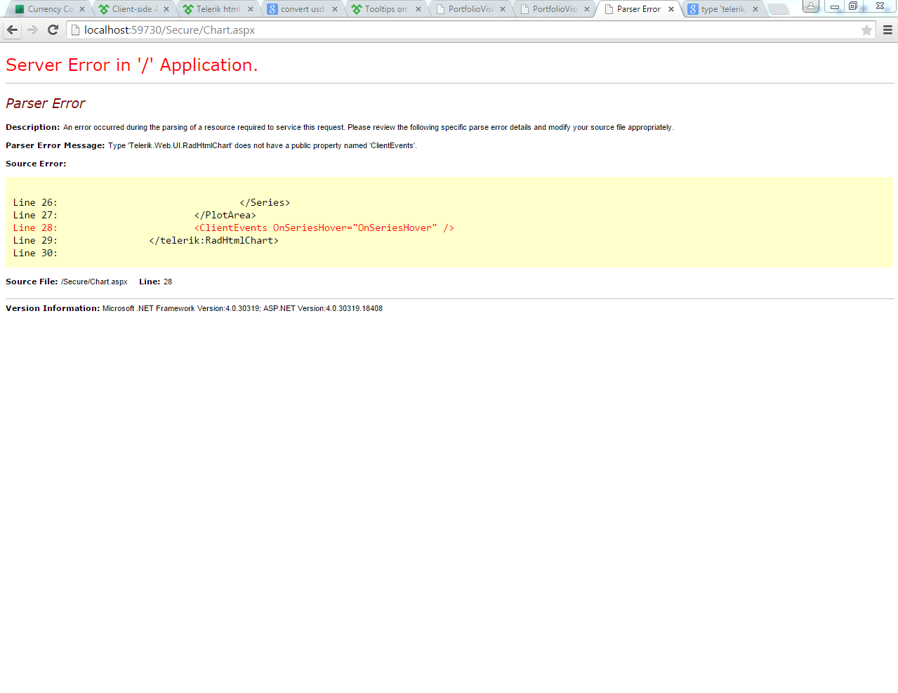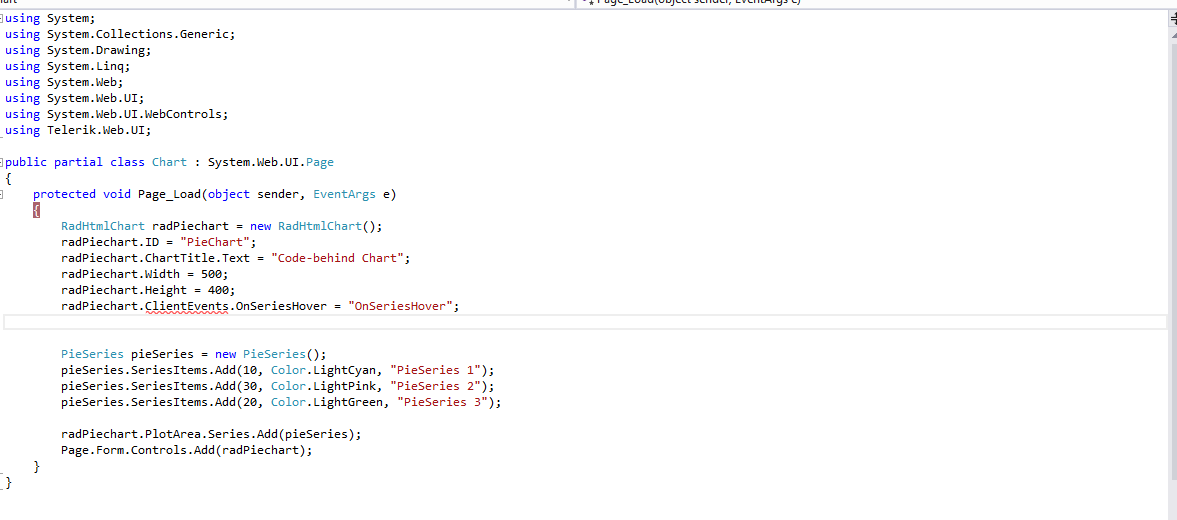 RadHtmlChart radPiechart = new RadHtmlChart();radPiechart.ID = "PieChart";radPiechart.ChartTitle.Text = "Code-behind Chart";radPiechart.Width = 500;radPiechart.Height = 400;radPiechart.OnClientSeriesHovered = "OnSeriesHover";...I am attaching the modified example so it is now working with the previous versions of the controls. I made my tests with version 2014.2.618.