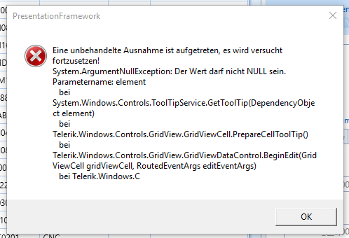 in the attached file you see the exception I get (Sorry, it's in German). The Problem with this exception is, that it appears not every time by doing the same steps. So we can't say definititly what step let this exception occures.