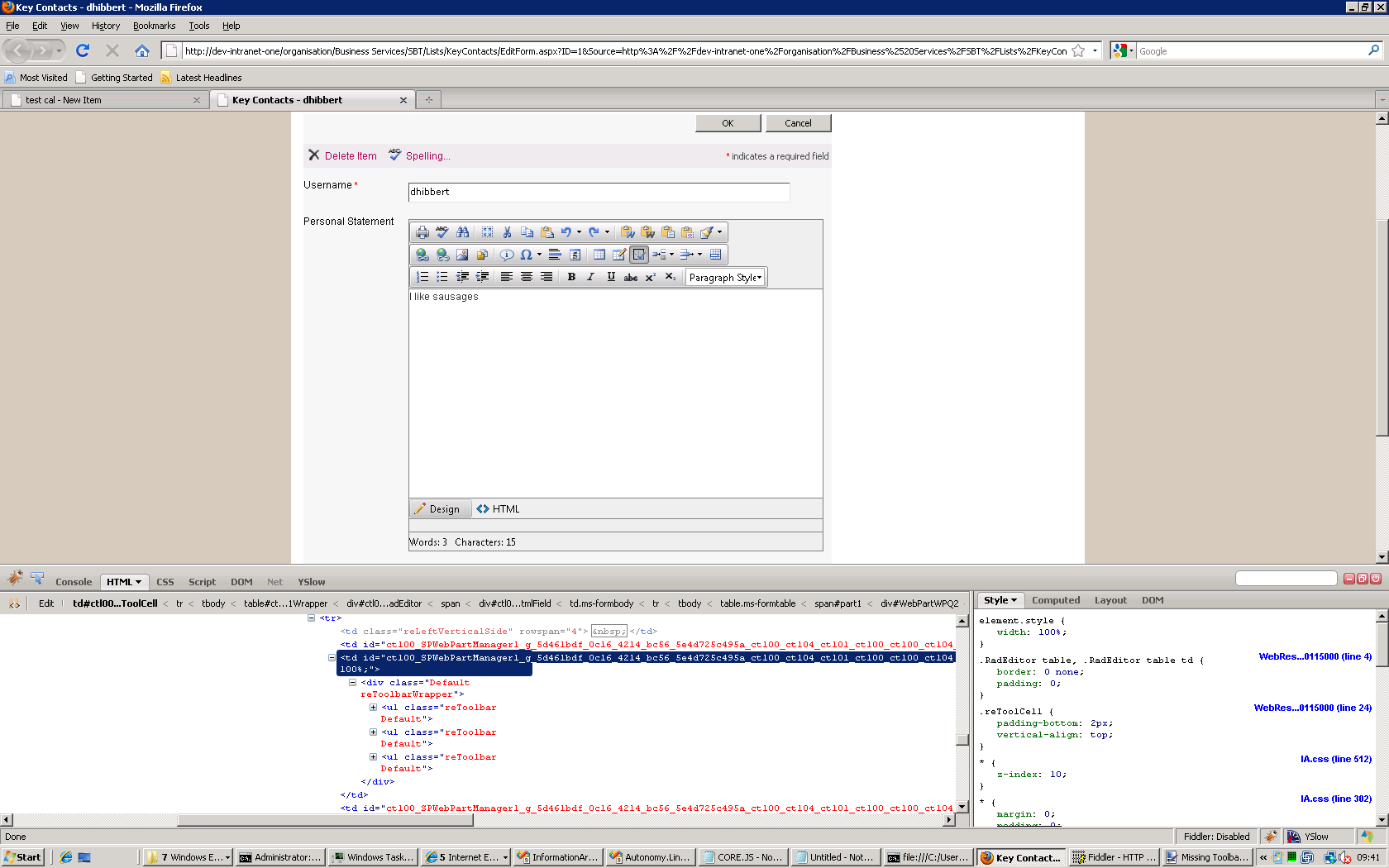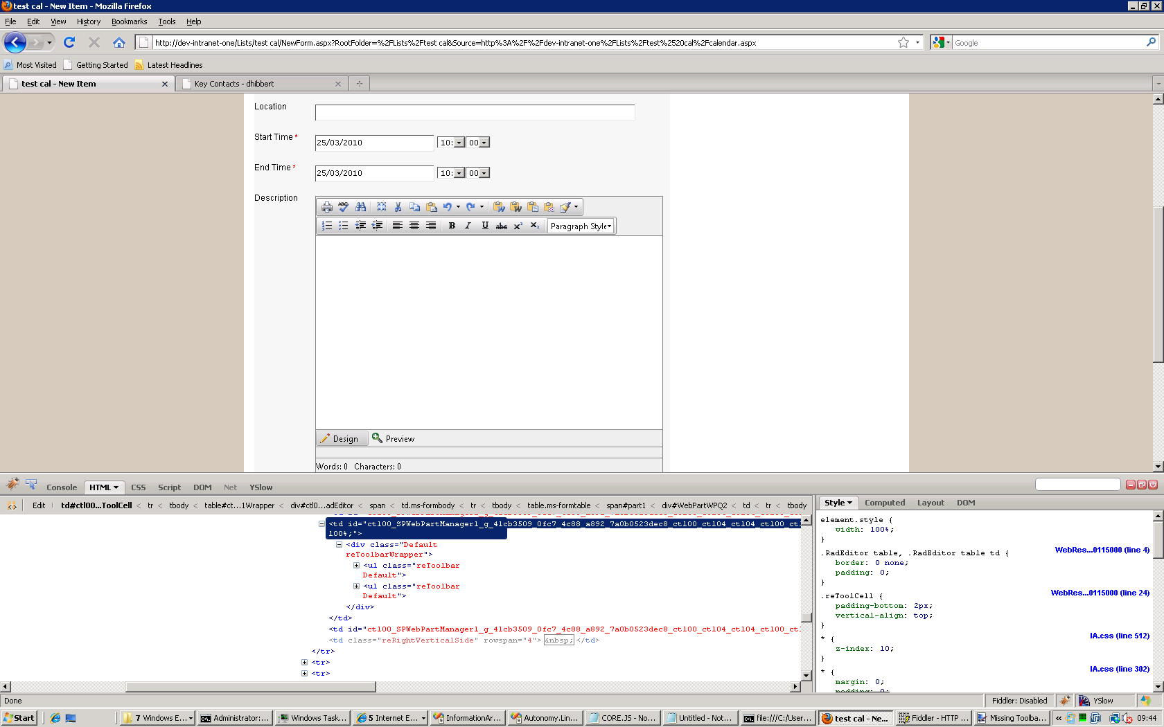 I've attached some images - I've tested the problem by swapping rows one and two around. The result is always the top toolbar is missing. I've tested this in IE 8 and Firefox 3.5 and get the same problem. I don't think this is css rated - the "missing toolbar in list item.png" shows the output in firebug - there are only two <ul> in reToolbarWrapper div. I'm wondering if there is something in the config file that is causing this?