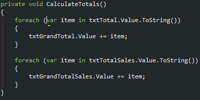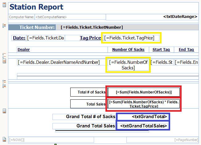 For Grand Total Sales I have tried a few different things but nothing has worked. I have tried =Sum(txtTotalSales.Value), =Sum(Sum(Fields.NumberOfSacks) * Fields.Ticket.TagPrice), and the for each statement in the codebehind.png.